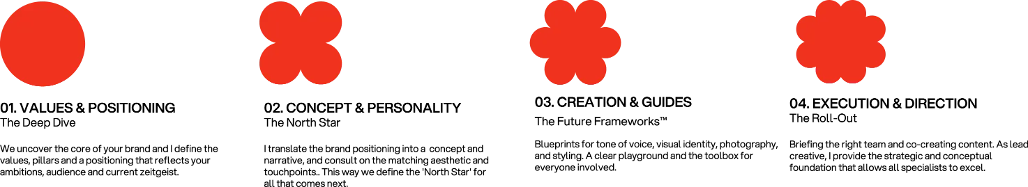 After a deep dive analysis of your goals and vision, I deliver my signature combination: a well thought out brand positioning and identity and my Future Frameworks™: bespoke creative blueprints designed for consistent execution on every touchpoint: from visual identity to tone of voice and photography.