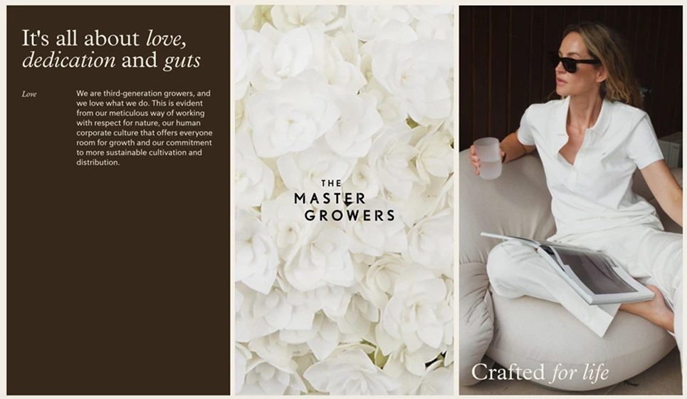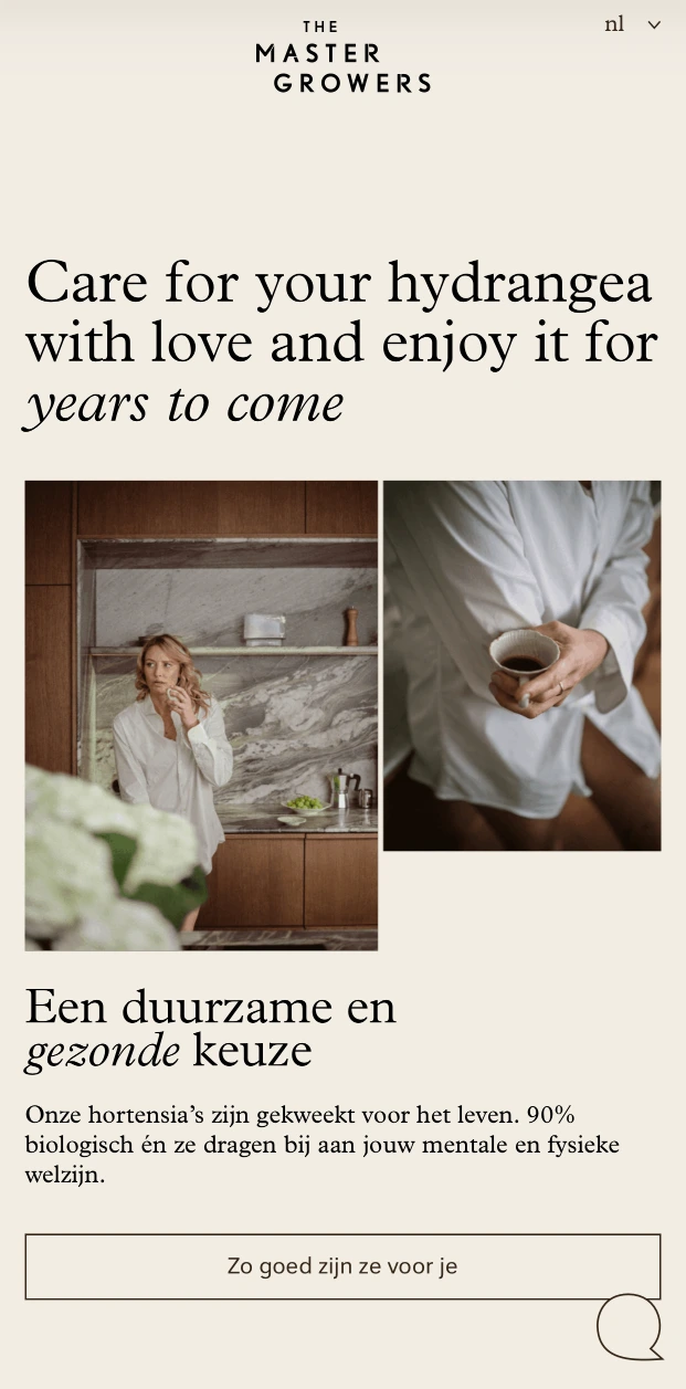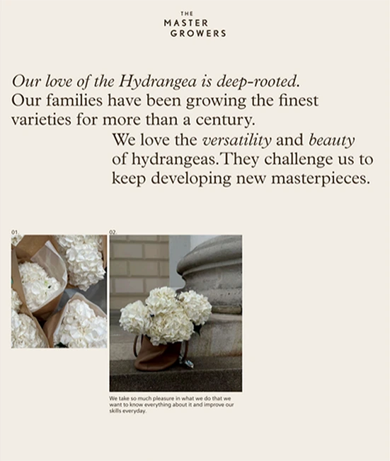 A refresh for these high end Dutch hydrangea breeders. Development of a complete brand persona, style consultancy, brand positioning, values & story, tone of voice, visual language concept, photoshoot art direction, and creative direction on every other touchpoint. A collaboration with brand manager Miranda van Kester. Identity: Kate Zest Studio Photography: Blickfanger